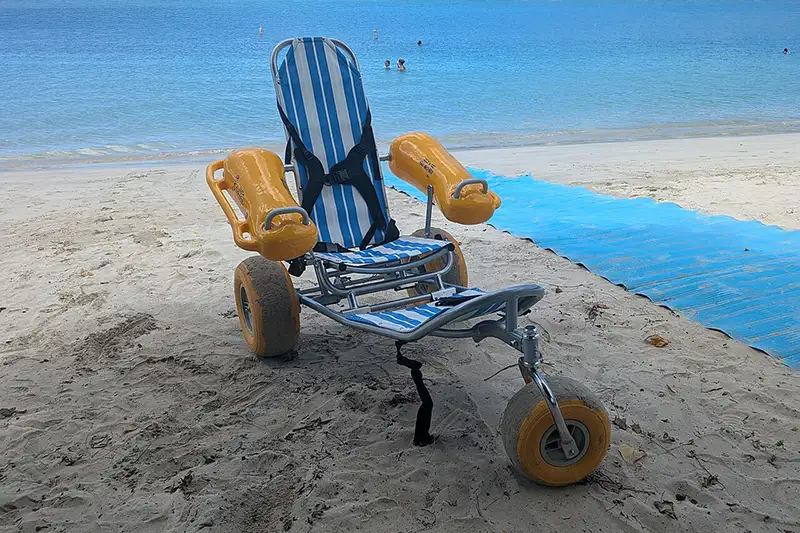 The standard sand beach wheelchairs are made of PVC pipe and have four balloon-like tires. They must be pushed by a companion, and they are not allowed to be taken into the water. They have a weight limit of 275 pounds.