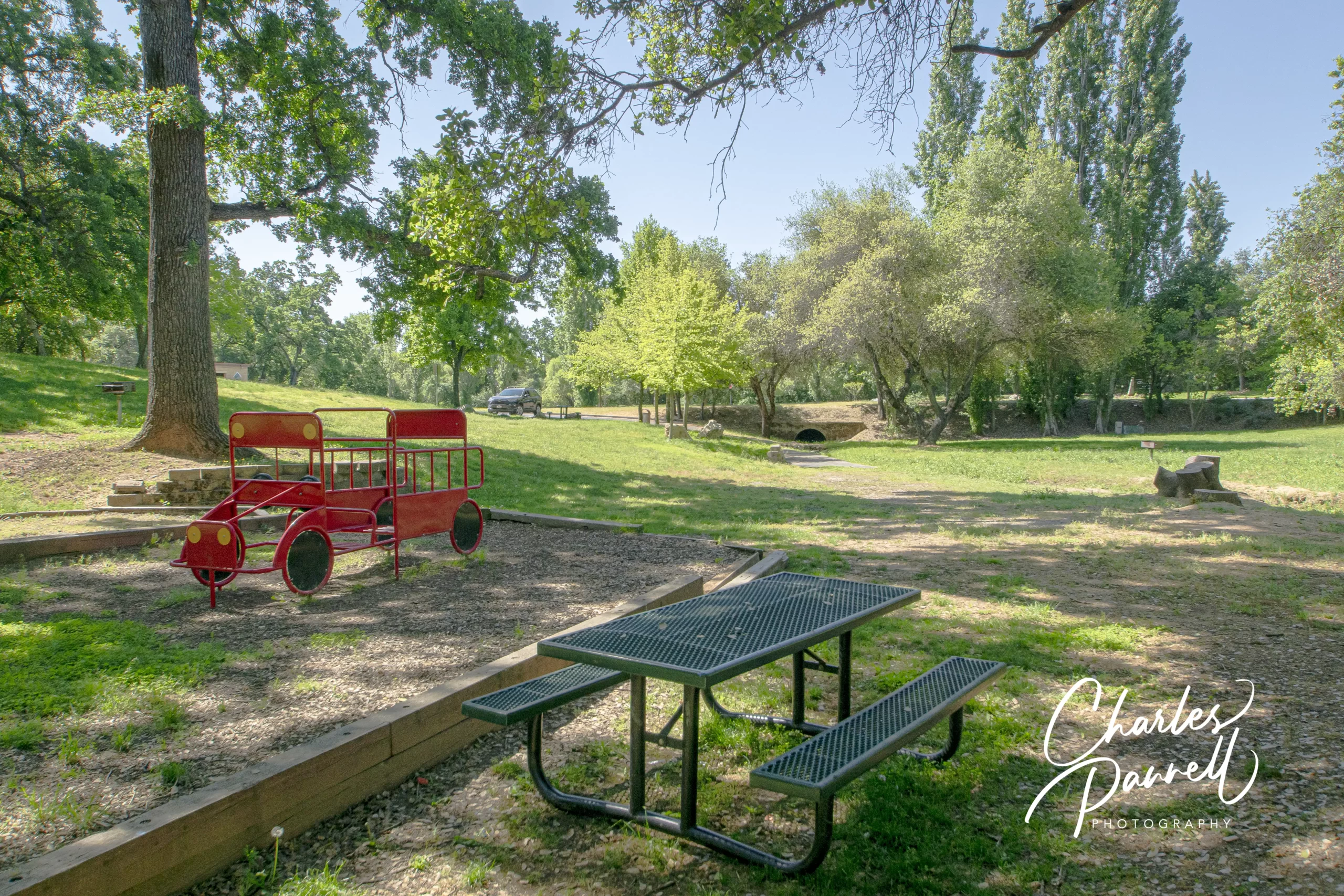 First up on the list of Calaveras County picnic areas is Gateway Park. This small park in Angels Camp is definitely off the tourist trek. There’s accessible parking next to an accessible restroom, and a level trail down to a picnic table in a grassy area. Although it’s a standard table, there’s room for a wheelchair at the end. There’s also a paved path along the creek to another table under a tree near the play area. And although it’s not a busy park, you may have a few deer join you for lunch.