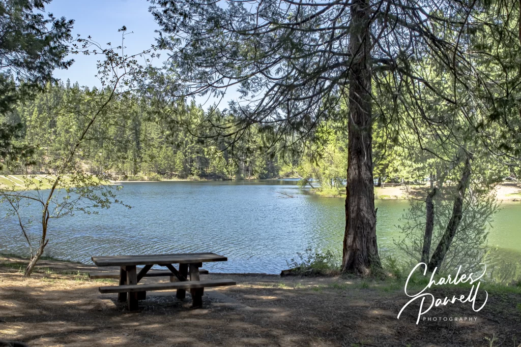 Next up on the list of Calaveras County picnic areas is White Pines Park. This small lakeside park is just down Dunbar Road from the Sierra Nevada Logging Museum. Turn left into the small parking lot just past the museum — it you hit Blagen Road, you’ve gone too far. There’s accessible parking near the lake, with level access out to an accessible picnic table. There are also BBQ grills available near the lakeside tables. And the great part about this park is that you can also wander over and enjoy the outdoor exhibits at the museum, even if they’re not open.