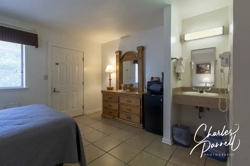 Accessible parking is located in front of room D2 — an accessible ground floor room – with sidewalk access over to the front door. Access features in room D2 include wide doorways, a lowered peephole, lever handles, good pathway access and tile floors for easy rolling. The room is furnished with a 25-inch high open-frame double bed with wheelchair access on the left side (as you face the bed). That said, there’s plenty of room to move the bed if you require wheelchair access on the opposite side. Other furnishings include a night stand, two easy chairs, a dresser, a refrigerator and a microwave.