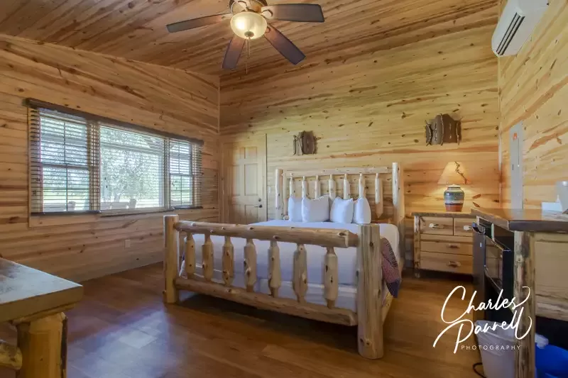 Access features include ramp access to the front porch, wide doorways, excellent pathway access, a lowered clothing rod, and wood floors for easy rolling. The interior is equally striking and includes walls paneled with beetle-kill pine from the Black Hills, and furnishings that are hand-crafted from Lodgepole pines.