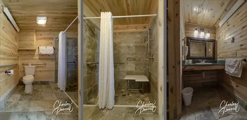 Access features include ramp access to the front porch, wide doorways, excellent pathway access, a lowered clothing rod, and wood floors for easy rolling. The interior is equally striking and includes walls paneled with beetle-kill pine from the Black Hills, and furnishings that are hand-crafted from Lodgepole pines.
