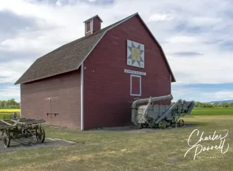 After lunch feel free to browse around the old homestead. The site is level and there are some gravel pathways but you’ll have to roll over the grass to get to a number of the buildings. There are a lot of farm out buildings as well as the old homestead to peruse. The barn area is also worth a look, and if you can’t manage the pathway, then it’s a short easy roll down Ferguson to get to it. There’s not much traffic on Ferguson, so it’s pretty safe. There’s a sizable display of farm implements next to the barn, and a decorative quilt square adorns the front. It’s a nice picnic spot, and a great place to dodge the crowds.