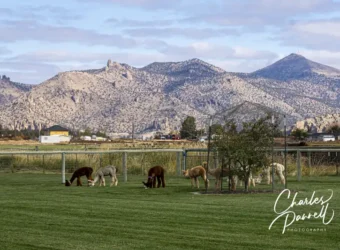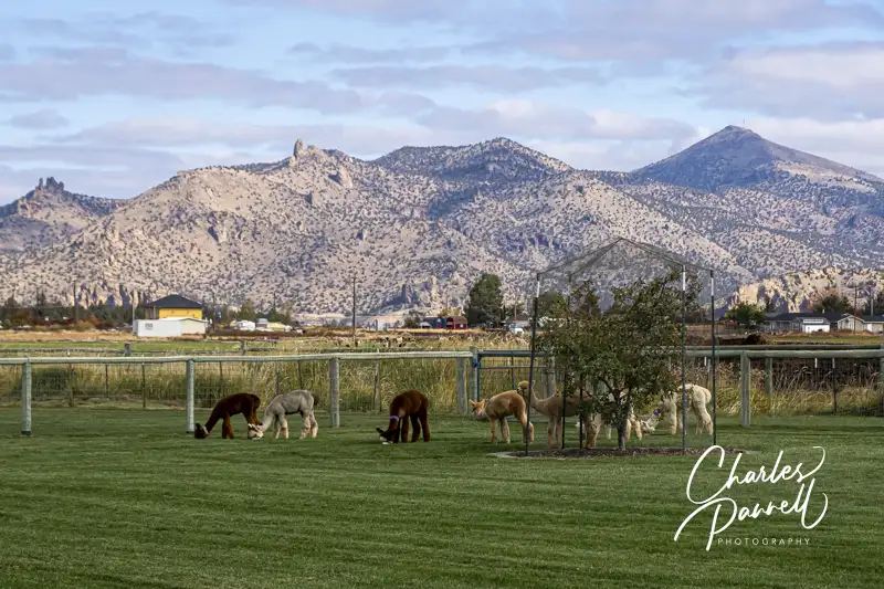 From there, you can wind around the barn and follow the marked path to the alpaca pens. The pathway is level, and a combination of dirt and grass. Although passable in a wheelchair, it’s muddy when it rains. The path winds arounds some large enclosures, and since the alpacas are used to getting fed, they’ll come up to you even if you don’t have any food. Along the way, you’ll get a little alpaca education from the informational signs posted on the pens. About half of the trail is doable for wheelchair-users; and after that the trail goes a bit uphill, crosses an irrigation pipe and bridge, and then heads over to the other side of the pasture. And the trail on that side is pretty uneven. So go in and enjoy the alpacas, and when the trail loses its access for you, just turn around. As an added bonus there are also some great views of the Three Sisters, Mt. Jefferson and Smith Rock from the ranch.