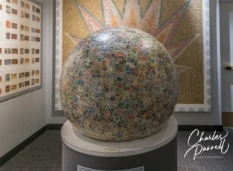 The stamp museum contains a number of themed displays that highlight stamps depicting children from around the world; but the piece de resistance is located in a small alcove in the back of the museum. The 600-pound stamp ball, which was crafted by students, is composed of over 4 million stamps and is recognized by Guinnessas the World’s Largest Stamp Ball. The stamp collage in the background is an impressive piece on its own, but the stamp ball definitely takes center stage.